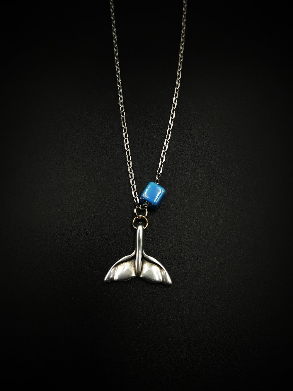 Χειροποίητο κολιέ με ατσάλινη αλυσίδα, ουρά γοργόνας και κεραμικό κυβάκι. Μήκος 45 εκ.