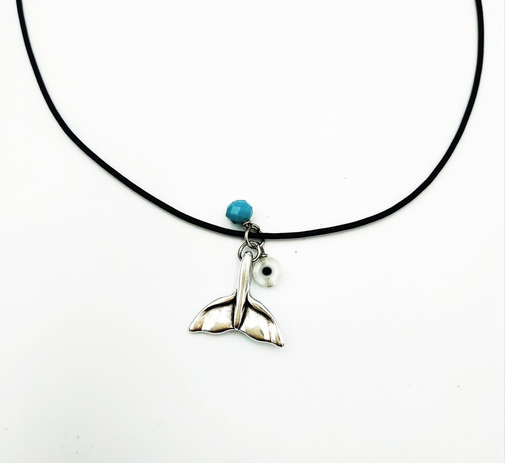 Χειροποίητο κολιέ με ουρά γοργόνας, ματάκια & δερμάτινο κορδόνι με ατσάλινο κούμπωμα. Μήκος 40cm & 5cm προέκταση.